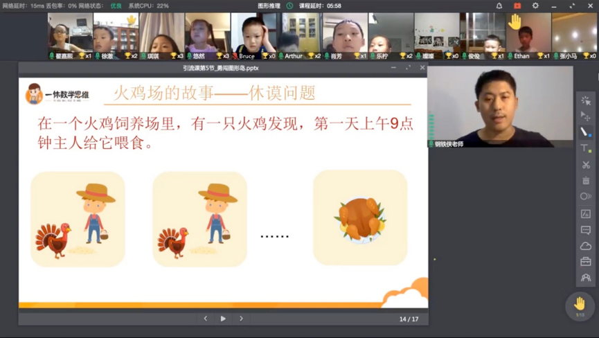 例如,在圖形推理課上,在教完傳統的根據圖形、數字規律推導出結論后,一休數學思維引入了一個火雞場的故事:一只火雞科學家總結歷史規律,得出“主人每天早上會來給大家喂食”的結論,但它在感恩節公布這條規律時,主人不但沒有投食、反而殺了這群火雞,以此引出哲學史上著名的“休謨問題”,啟迪孩子所有的知識、結論都是在一定的限定條件下才成立的,歸納法是不夠嚴謹的、不要被既有知識、思路固化思維,從而培養孩子批評性思維、進而通過親子互動培養孩子創新性思維。