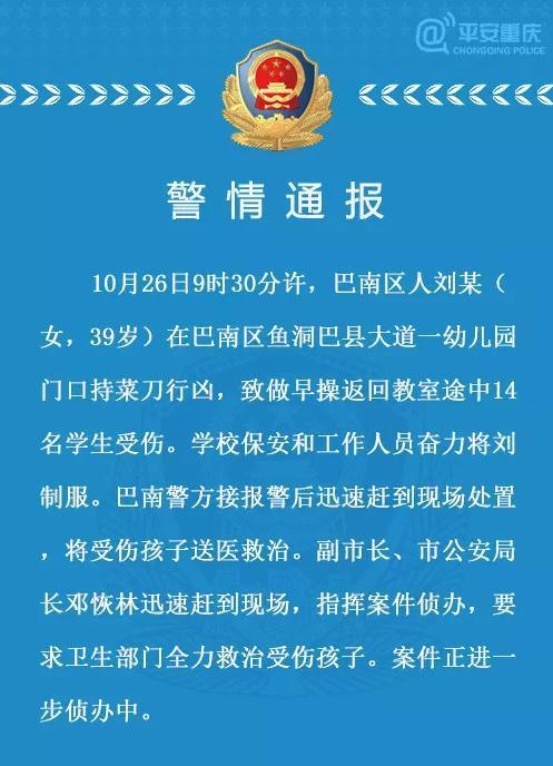 據中新網消息,10 月 26 日上午,巴南區魚洞新世紀幼兒園的多名兒童,被一名婦女砍傷。當地警方通報稱,一名 39 歲女子持菜刀闖入幼兒園,14 名兒童受傷送醫。行兇者被當場制服,目前案件正在進一步偵辦中。