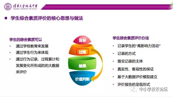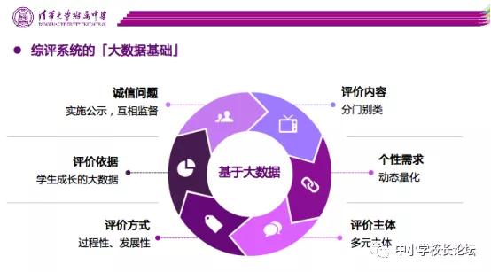 2009年,清華附中梳理了學生在校期間的教育行為,通過聚類分析和相關性分析,總結(jié)學生在校期間的高影響力活動。結(jié)合20世紀50年代以來的優(yōu)秀教育理論,采取自下而上的方式對學生各個方面進行觀察、記錄、分析,建立了包含9個模塊46個維度的行為記錄內(nèi)容,構建了學生綜合素質(zhì)生成性評價模型,并利用大數(shù)據(jù)分析技術,開發(fā)學生綜合素質(zhì)生成性評價系統(tǒng)。全面記錄學生校內(nèi)外的成長軌跡,從中挖掘?qū)W生未來發(fā)展?jié)撃芎蛢A向,為每一個學生的個性、自主、健康和全面發(fā)展創(chuàng)造條件。