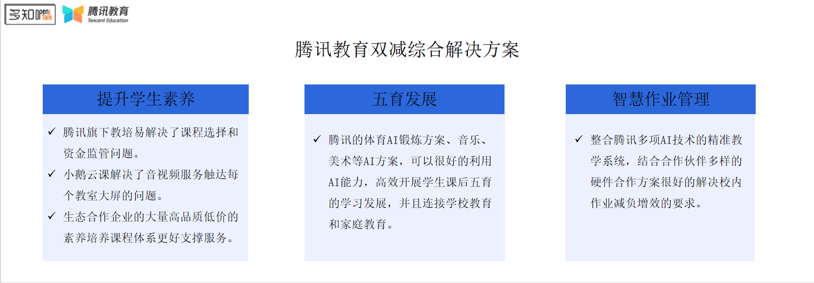 整體來說,騰訊著力在結合我們核心的產品和技術優勢,為教育打造三個技術基座,一個是教育考評AI基座,一個是精準教學AI基座,還有云音視頻AI基座,我們在這三個基座上做了一些產品,也跟業內資深的合作伙伴一起提供了相應場景解決方案。這些解決方案在課后延時服務領域有很好的落地應用效果,能滿足課后服務需求。