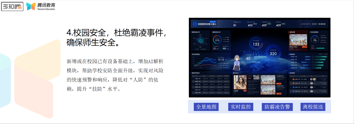騰訊提供四類場景建設,分別是校內作業講評輔導、素質類課程云課教學、體育鍛煉與指導以及防霸凌與校園安全。