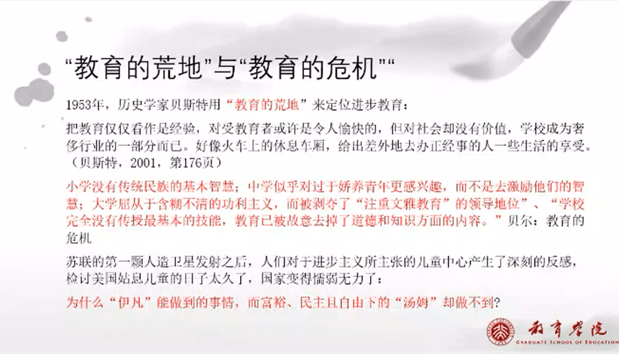 當年貝斯特在教育的荒地里面就批評過,他說我們如何滿足于廢棄自律的價值,在一個制度和文化的爭鋒中, 為教學技術而發展教學技術,無疑是把教育大廈,放置在一片荒地里面去。
