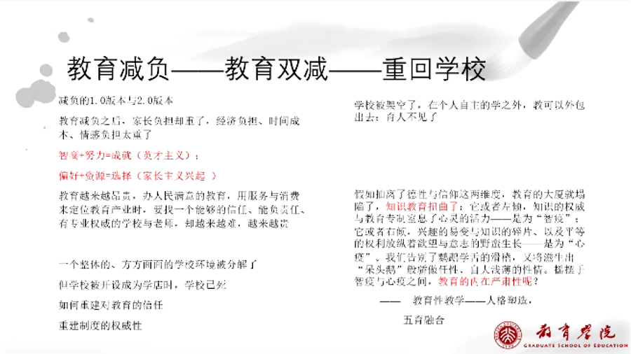 “雙減”政策,我覺得很重要的一點就是 重回學校,重新回到不再過去那樣一個被架空的學校,這個學校它有一個非常重要的內在的嚴肅性。