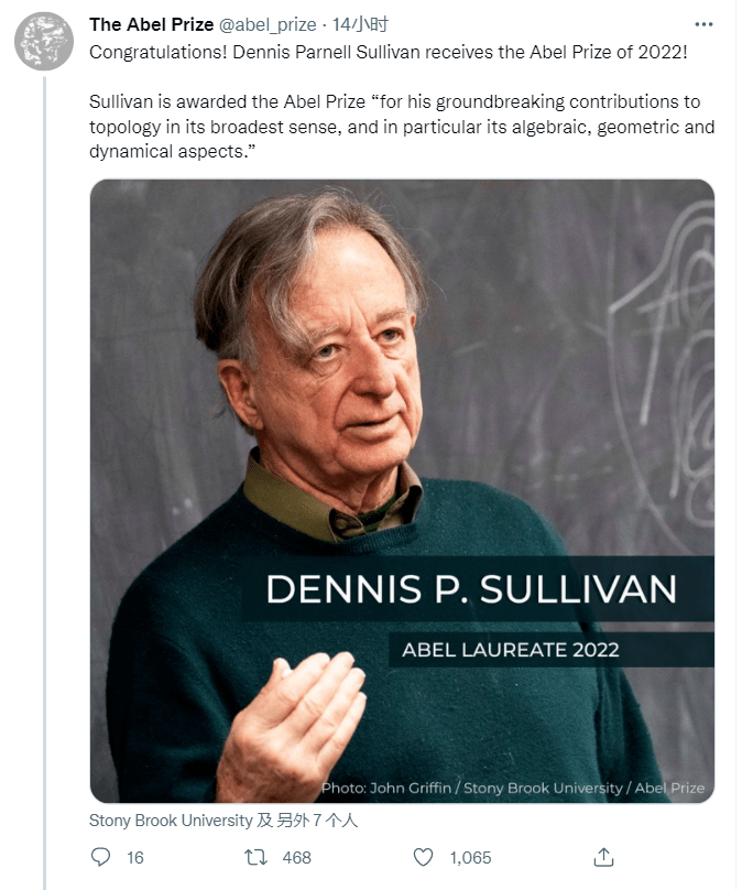 阿貝爾獎(jiǎng)官方推特也第一時(shí)間公布了這個(gè)消息,并對(duì)沙利文教授表示祝賀。