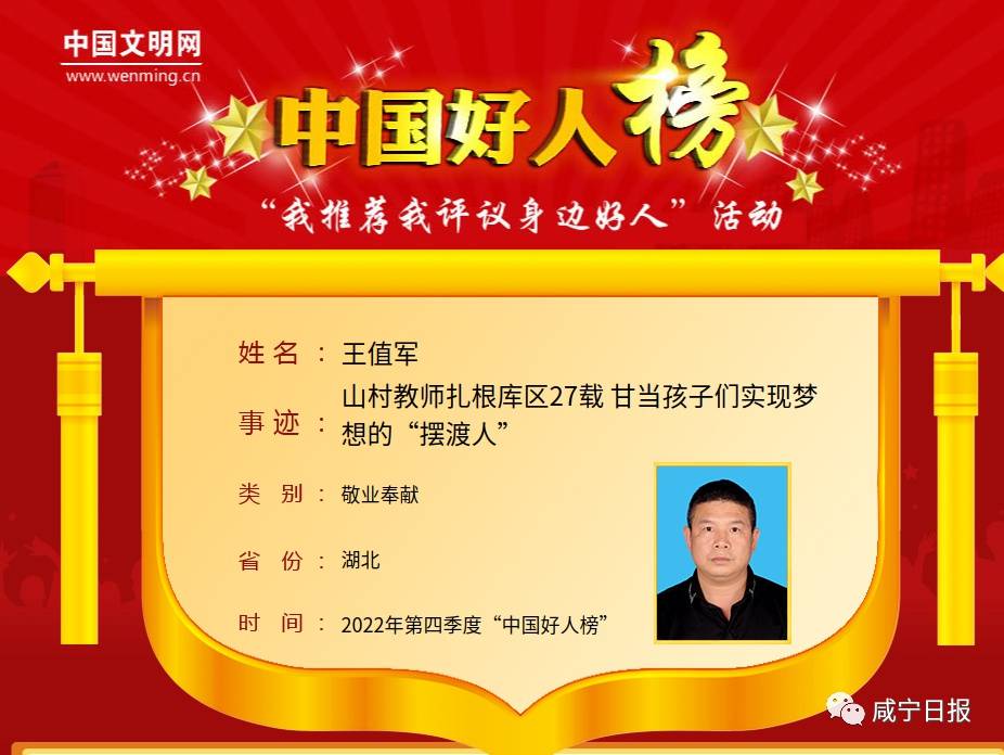 1月19日,據咸寧日報消息,日前,中央文明辦發布2022年第四季度“中國好人榜”,我市王值軍獲評敬業奉獻類“中國好人”!