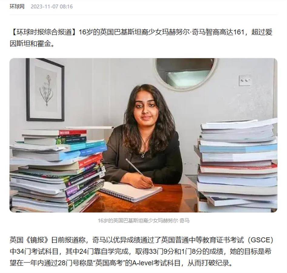 16歲的英國巴基斯坦裔少女瑪赫努爾·奇馬智商高達161,超過愛因斯坦和霍金。