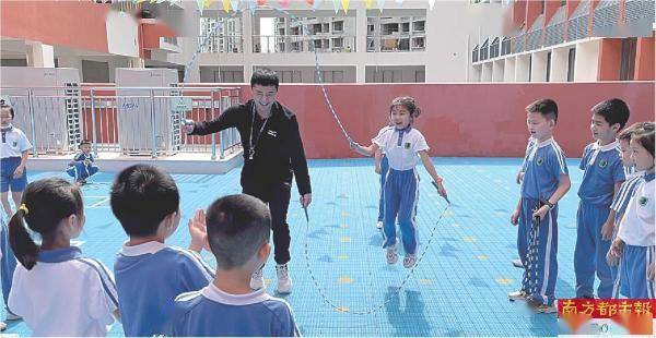 王輝輝老師和學(xué)生們在校園里跳繩。