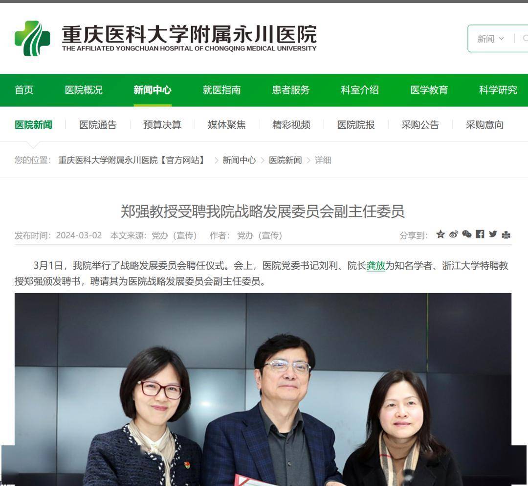 另據(jù)重慶醫(yī)科大學(xué)附屬永川醫(yī)院官網(wǎng)介紹,3月1日,該院舉行了戰(zhàn)略發(fā)展委員會(huì)聘任儀式。會(huì)上,醫(yī)院黨委書記劉利、院長(zhǎng)龔放為知名學(xué)者、浙江大學(xué)特聘教授鄭強(qiáng)頒發(fā)聘書,聘請(qǐng)其為醫(yī)院戰(zhàn)略發(fā)展委員會(huì)副主任委員。
