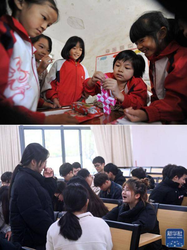 這是一張拼版照片,上圖為:在廣西靈川縣靈川鎮(zhèn)的三叉尾小學(xué),董倩(右二)課間和同學(xué)在一起(2012年9月13日攝)。下圖為:在廣西桂林師范高等專科學(xué)校,董倩(二排右一)課間和同學(xué)聊天(2024年3月13日攝)。