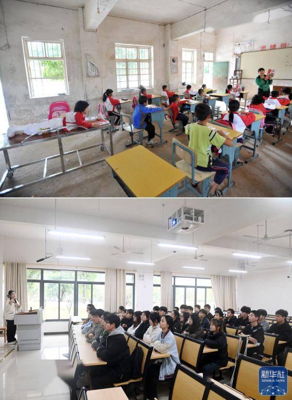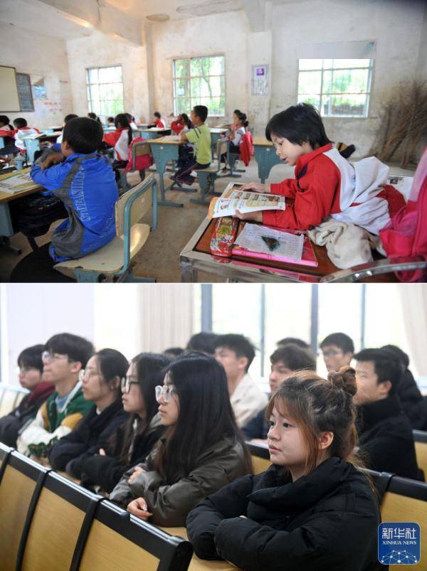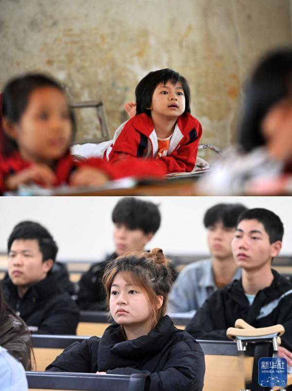 這是一張拼版照片,上圖為:在廣西靈川縣靈川鎮(zhèn)的三叉尾小學(xué),董倩趴在床上聽課(2012年9月13日攝)。下圖為:在廣西桂林師范高等專科學(xué)校,董倩(三排右一)在課堂上聽課(2024年3月13日攝)。