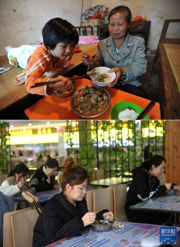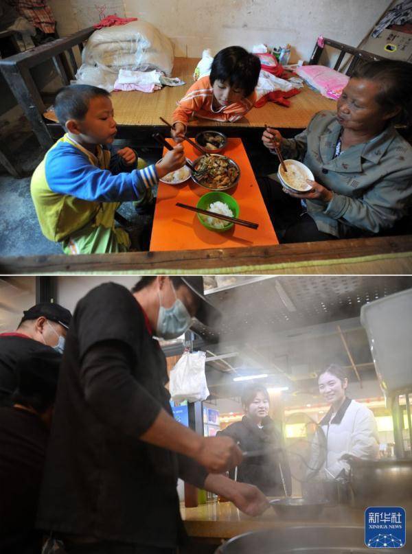 這是一張拼版照片,上圖為:在廣西靈川縣靈川鎮(zhèn)的三叉尾小學(xué),董倩在宿舍和奶奶一起吃午飯(2012年9月13日攝)。下圖為:在廣西桂林師范高等專科學(xué)校,董倩(前)在食堂用餐(2024年3月13日攝)。
