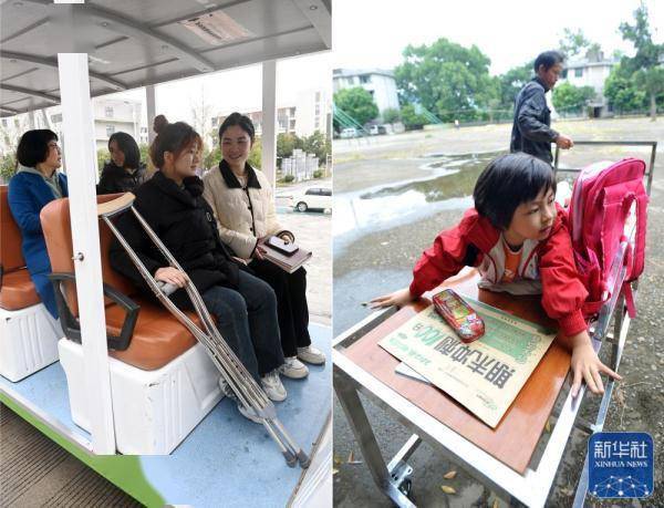 這是一張拼版照片,左圖為:在廣西桂林師范高等專科學(xué)校,董倩(前排左一)課后坐著校園擺渡車去飯?zhí)贸燥垼?024年3月13日攝)。右圖為:在廣西靈川縣靈川鎮(zhèn)的三叉尾小學(xué),董倩的父親董慧玲課后拉著可以移動(dòng)的床將她帶回宿舍吃飯(2012年9月13日攝)。