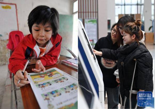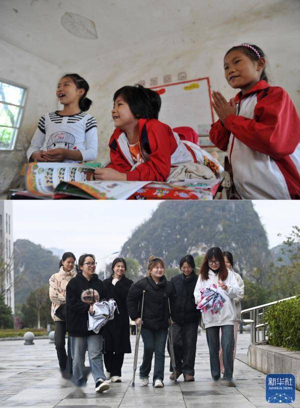 這是一張拼版照片,上圖為:在廣西靈川縣靈川鎮(zhèn)的三叉尾小學(xué),董倩(中)課間和同學(xué)在一起(2012年9月13日攝)。下圖為:在廣西桂林師范高等專科學(xué)校,董倩(左四)課后和同學(xué)走在校園里(2024年3月13日攝)。