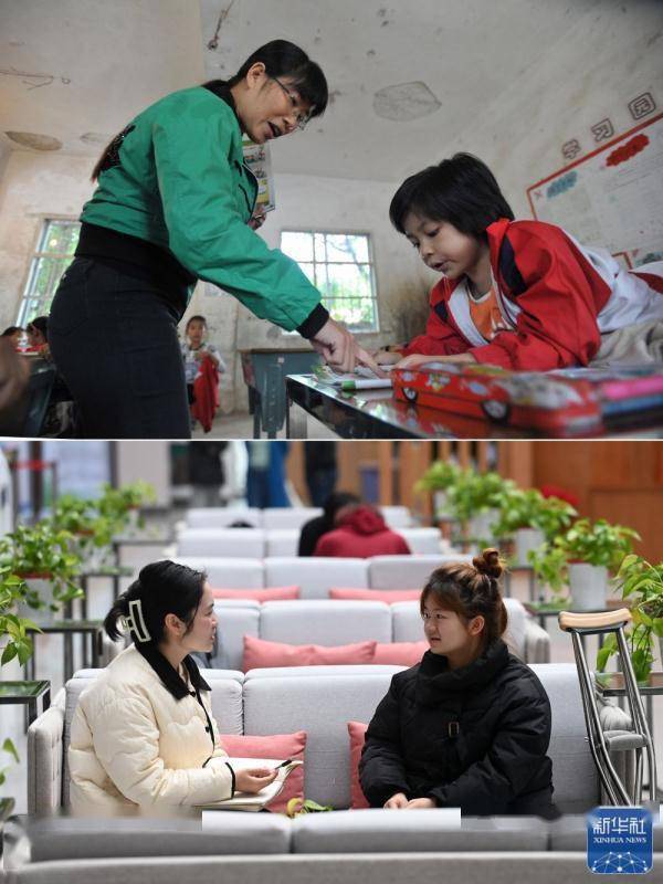 這是一張拼版照片,上圖為:在廣西靈川縣靈川鎮(zhèn)的三叉尾小學(xué),董倩趴在床上聽英語(yǔ)老師文秋紅輔導(dǎo)功課(2012年9月13日攝)。下圖為:在廣西桂林師范高等專科學(xué)校,董倩(右)在和大學(xué)輔導(dǎo)員毛文慧老師談心(2024年3月13日攝)。