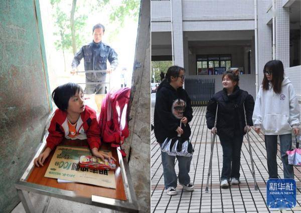 這是一張拼版照片,左圖為:在廣西靈川縣靈川鎮(zhèn)的三叉尾小學(xué),董倩的父親董慧玲課后拉著可以移動(dòng)的床將她帶出教室(2012年9月13日攝)。右圖為:在廣西桂林師范高等專科學(xué)校,董倩(中)課后和同學(xué)走在教室外(2024年3月13日攝)。