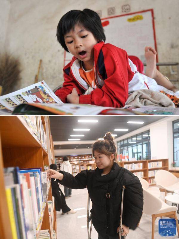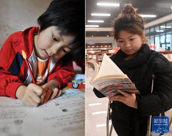 這是一張拼版照片,左圖為:在廣西靈川縣靈川鎮(zhèn)的三叉尾小學(xué),董倩趴在床上學(xué)習(xí)(2012年9月13日攝)。右圖為:在廣西桂林師范高等專科學(xué)校,董倩在圖書館看書(2024年3月13日攝)。