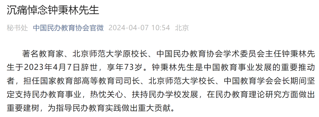 4月7日,中國民辦教育協會官微發布消息:著名教育家、北京師范大學原校長、中國民辦教育協會學術委員會主任鐘秉林先生于2024年4月7日辭世,享年73歲。