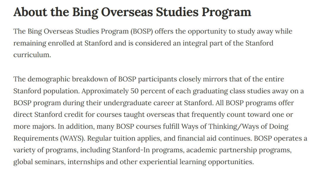 海外研究計劃 (BOSP) 為學生提供了在斯坦福大學就讀的同時外出學習的機會,被認為是斯坦福大學課程不可或缺的一部分。