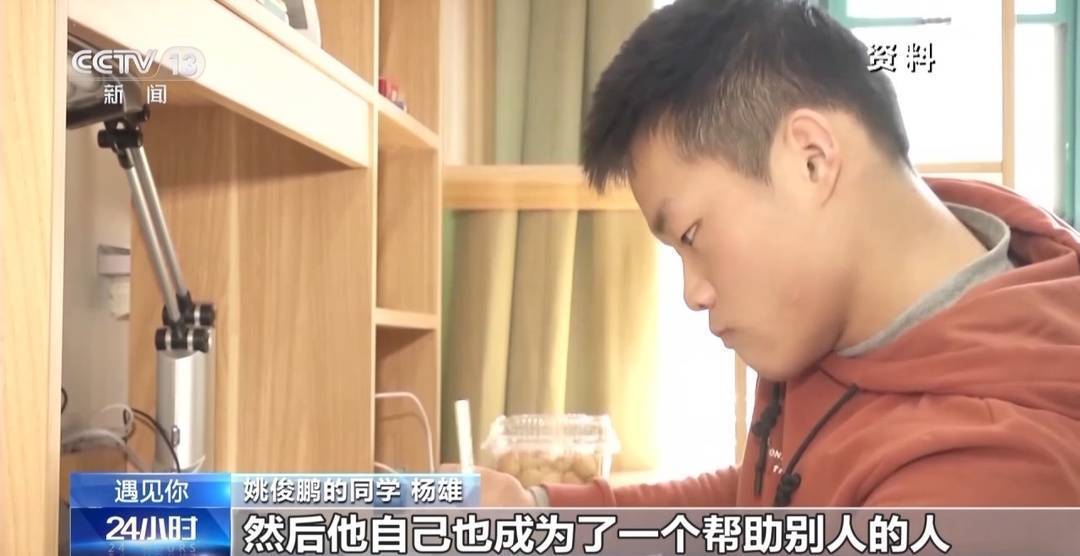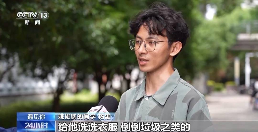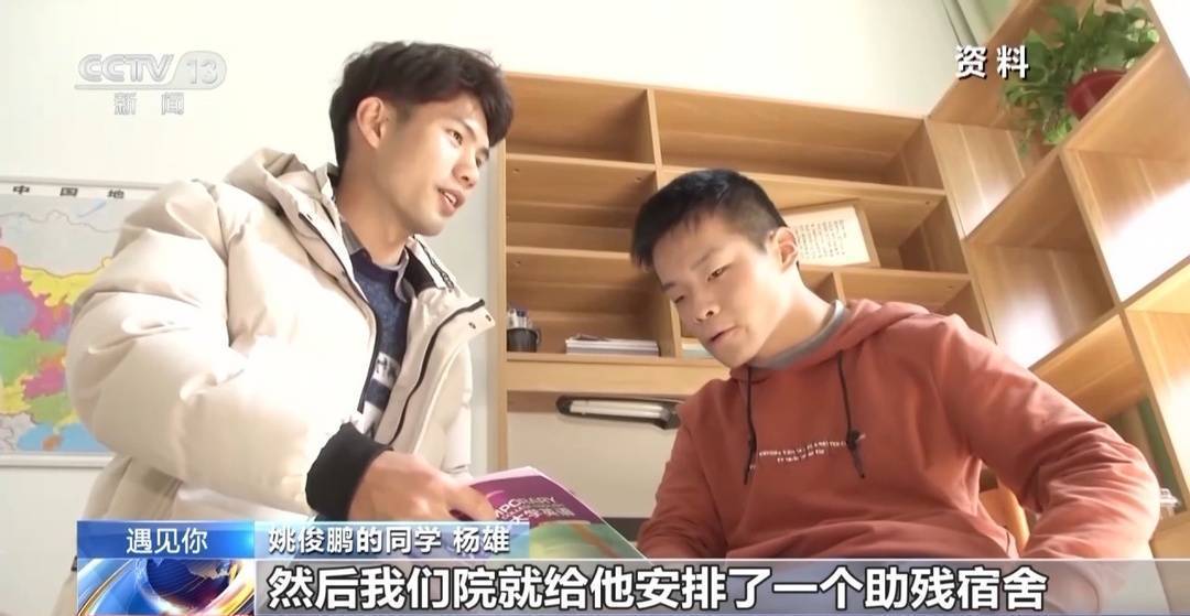姚俊鵬的同學 楊雄:他在宿舍里面洗手、洗臉之類的不太方便,然后我們院就給他安排了一個助殘宿舍。我們茯苓小隊的隊員,大部分都是男生,我們幾個宿舍都和他挨在一起的,方便對他進行幫助。給他洗洗衣服、倒倒垃圾之類的,然后幫他打打飯。