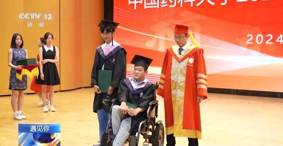 6月18日,中國藥科大學舉行了2024屆本科生的畢業典禮。姚俊鵬穿著學士服,坐在典禮現場,顯得非常開心。