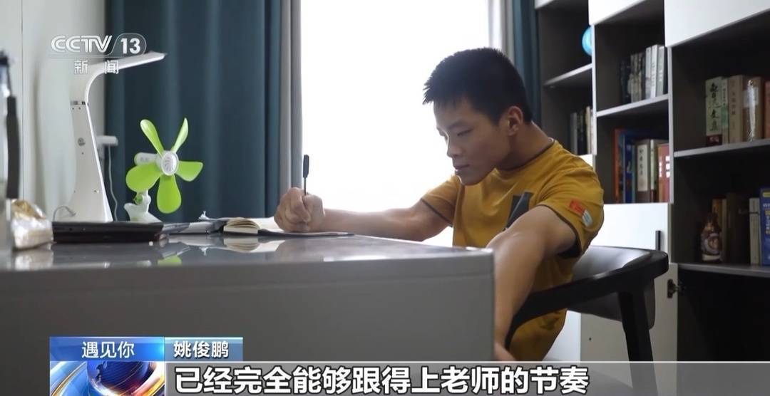 姚俊鵬的同學 楊雄:一開始我們的同學會幫他做筆記,到后來他自己用了平板,他自己也可以在紙上記東西了,我們就沒有再幫他。他后來甚至靠著他的平板,給我們全班人做了一份化學筆記。