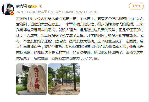9月13日晚,唐尚珺發(fā)文回應(yīng)室友全部申搬離傳聞。