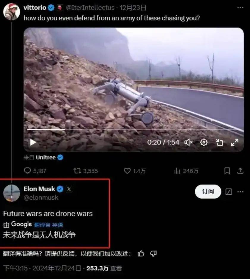 不光黃仁勛感到敬佩,特斯拉創始人馬斯克也被宇樹科技在2024年底發布的B2-W機器狗演示視頻驚呆了。視頻里,“B2-W機器狗展現了包括后空翻、高空跳躍、載人越障等在內的一系列超高難度動作。”馬斯克看了連忙點贊評價,“未來的戰爭,是無人機的戰爭”。