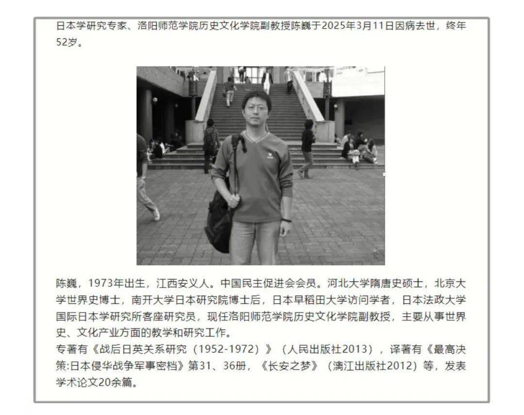 2025年3月11日,洛陽師范學院歷史文化學院副教授陳巍的生命定格在52歲。