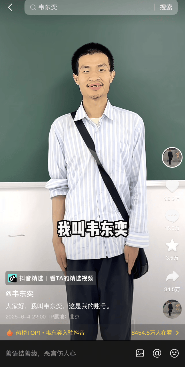 近日,被網(wǎng)友時常稱為“韋神”的北京大學數(shù)學科學學院助理教授韋東奕,在抖音平臺開設了個人賬號,名為“韋東奕”,并發(fā)布了一則4秒短視頻。視頻中,韋東奕身著標志性藍白條紋襯衫,站在黑板前以極簡方式介紹:“大家好,我叫韋東奕,這是我的賬號。”這則看似普通的視頻迅速引發(fā)網(wǎng)友圍觀和點擊——截至6月6日17時,賬號粉絲數(shù)從最初的1000余人暴漲至250.1萬,唯一的一條作品視頻點贊量已突破90萬,評論區(qū)涌入超16萬條留言,并秒變“高考許愿池”,大量考生、家長留言“沾喜氣”“求數(shù)學高分”。