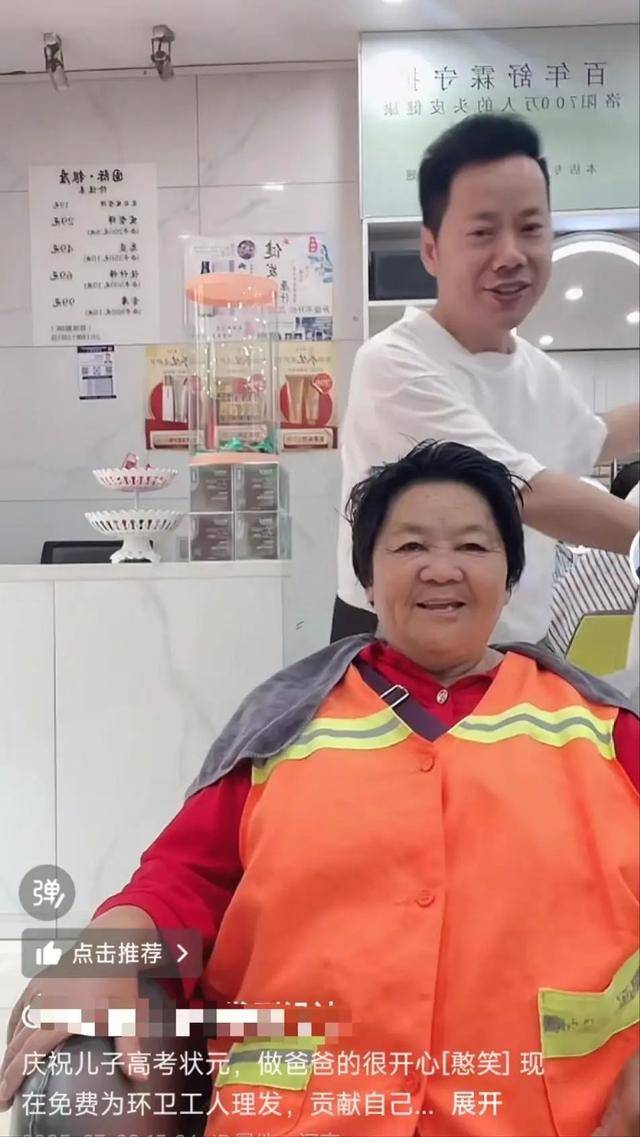 據(jù)張先生發(fā)布的視頻,其子高考總成績?yōu)?04分,其中語文130分,數(shù)學(xué)138分,外語139分,物理、化學(xué)、生物學(xué)分別為100分、98分、99分,目前已報考清華大學(xué)。張先生稱,得知兒子高考成績后,他在自家理發(fā)店門前張貼慶祝橫幅,恰好有環(huán)衛(wèi)工人路過觀看,他注意到由于天氣炎熱,環(huán)衛(wèi)工人大多頭發(fā)長,滿頭是汗,為幫助他人、回饋社會,他開始發(fā)布視頻,稱將義務(wù)為環(huán)衛(wèi)工人理發(fā)。