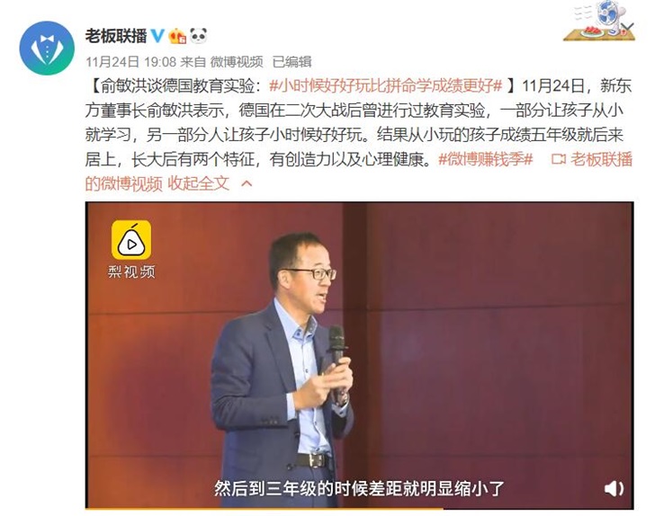 11月24日,新東方董事長俞敏洪在邁格爾8周年講座上表示,德國在二次大戰后曾進行過教育實驗,一部分讓孩子從小就學習,另一部分人讓孩子小時候好好玩。結果從小玩的孩子成績五年級就后來居上,長大后有兩個特征,有創造力以及心理健康。