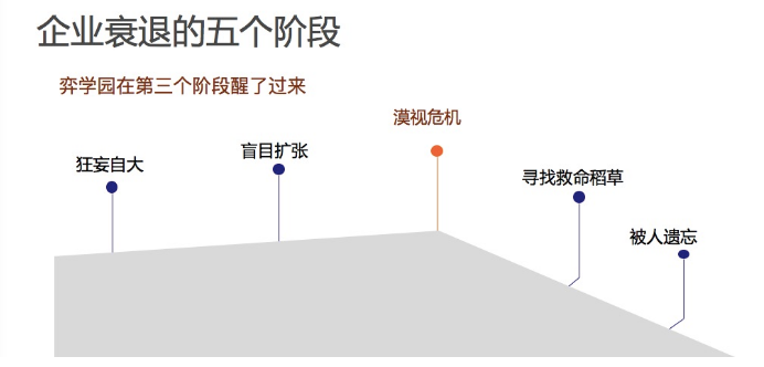 吉姆·科林斯在《再造卓越》中提到企業衰退的五個階段,首先狂妄自大,然后開始盲目擴張,當企業出現危機的時候漠視危機,然后開始尋找救命稻草,最后被人遺忘。弈學園算是在第三個階段醒了過來。2017年之前,每開一家新校區我都會覺得很開心,到了2018年,每關閉一家新校區我都會覺得很安心。