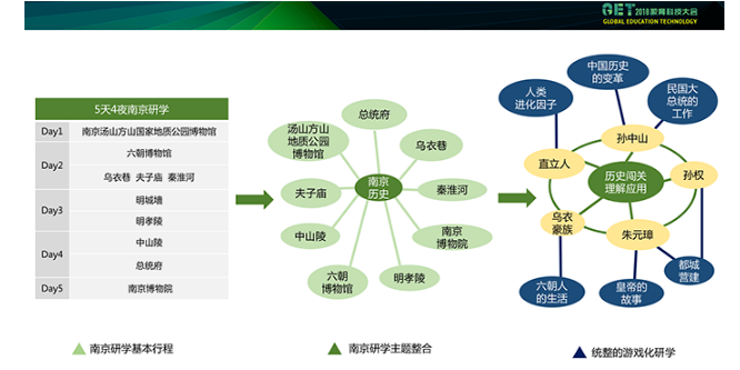 再看看統(tǒng)整課程的邏輯如何具體運(yùn)用到研學(xué)課程的設(shè)計(jì)。上面第一張表格是常見的行程表,第二張圖是南京的景點(diǎn),把它做成一個(gè)地圖串聯(lián)在一起,第三張圖是我推崇的也是目前尤里卡采用的方式。在這里特別解釋以下第三張圖黃色圈層的概念,為什么要圍繞南京設(shè)計(jì)直立人、烏衣豪族、朱元璋等人物?其實(shí)是因?yàn)槲覀兿胪ㄟ^這場研學(xué),讓同學(xué)們了解明朝的歷史人物是如何影響、推動(dòng)歷史進(jìn)程的,所以課程設(shè)計(jì)的中心結(jié)構(gòu)是用人物和事件的關(guān)系來搭建。