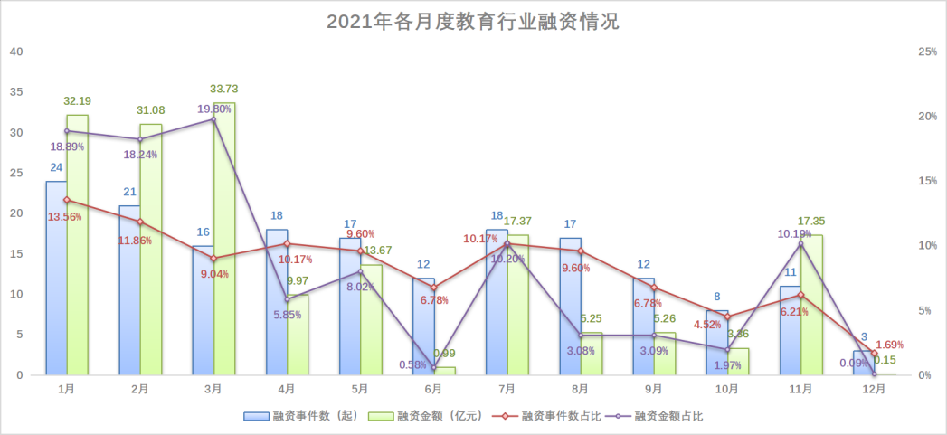 據不完全統計,2021年截至12月29日,教育行業共披露177起融資事件,融資總金額為170.38億元