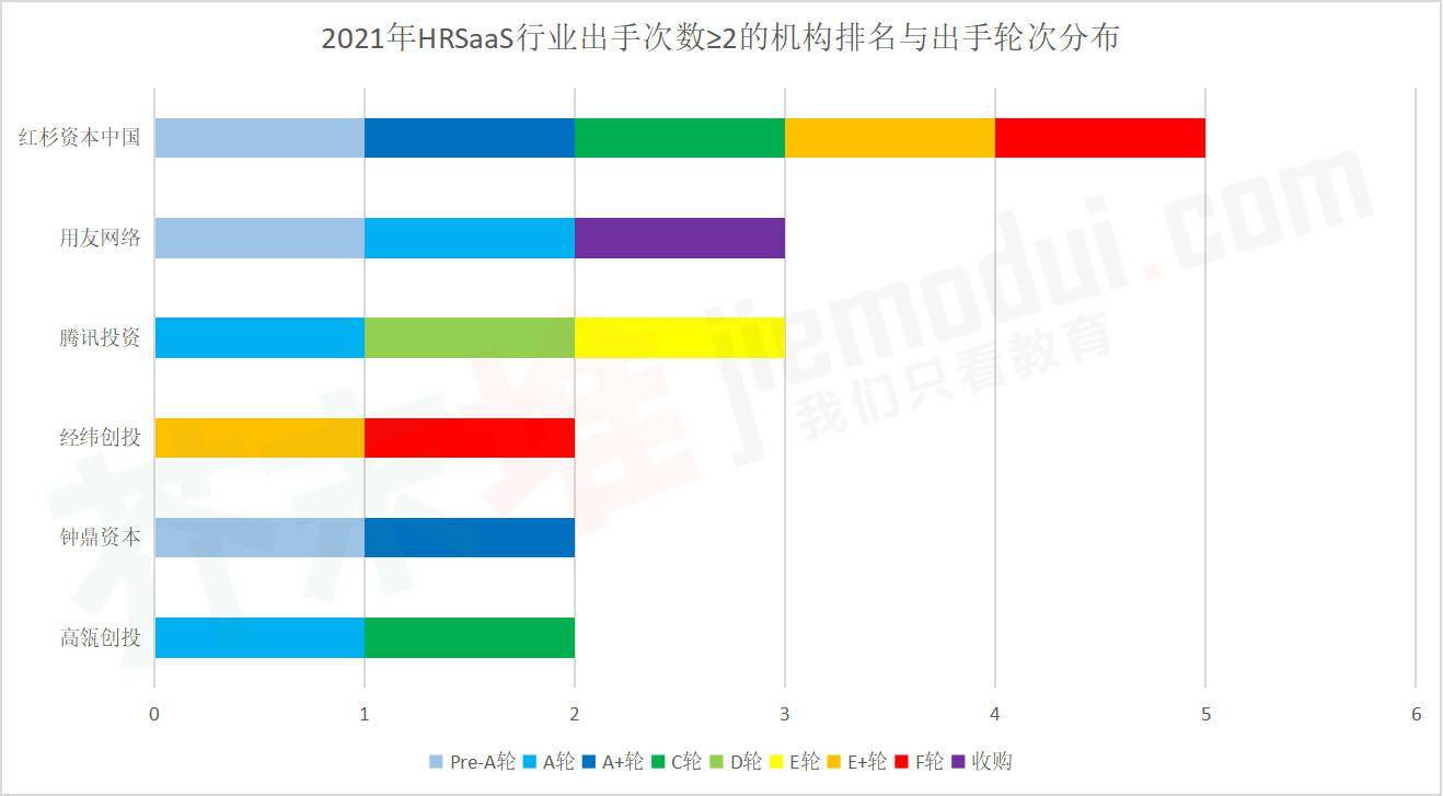 與這兩家機(jī)構(gòu)形成明顯對比的是經(jīng)緯創(chuàng)投,經(jīng)緯創(chuàng)投更看好成熟企業(yè),一次投資為E+輪,一次投資為F輪。前者是企業(yè)培訓(xùn)領(lǐng)域的最高融資,投資對象為云學(xué)堂,最終融資金額為1.9億美元;后者為HRSaaS全行業(yè)2021年最高融資,投資對象為北森,最終融資金額為2.6億美元。