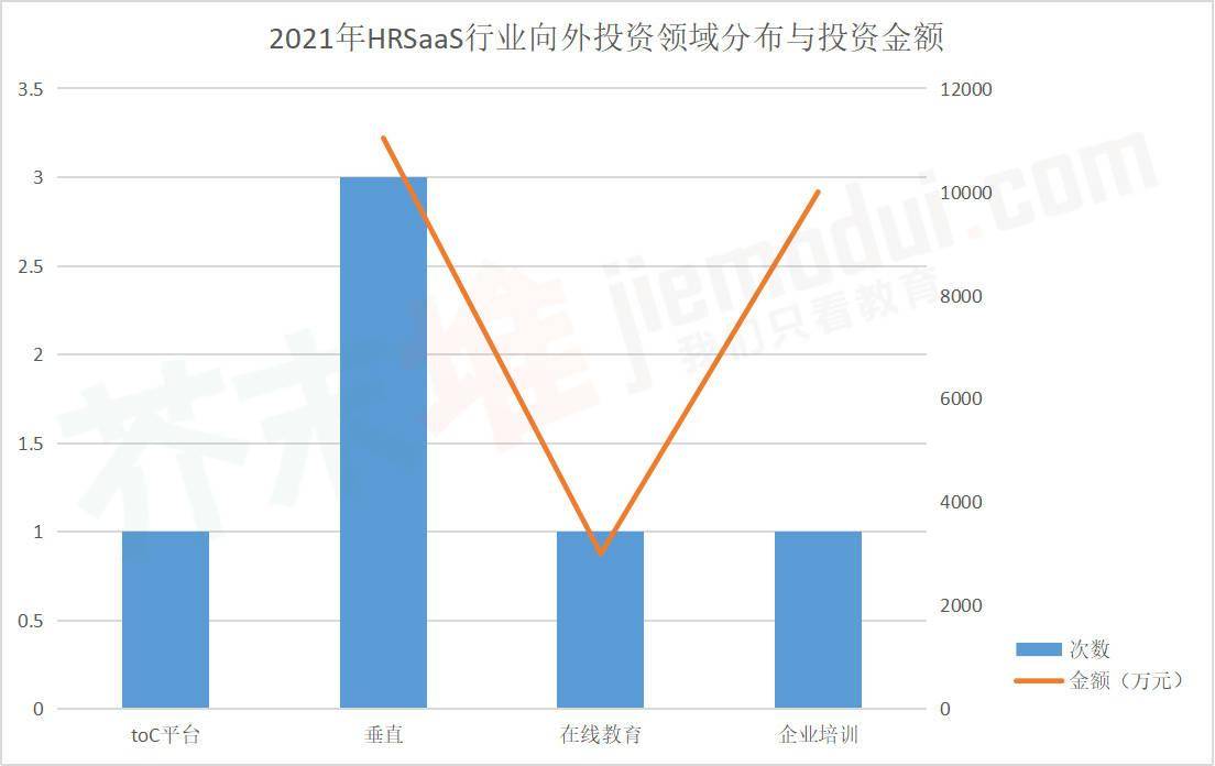 據(jù)芥末堆統(tǒng)計,2021年,HRSaaS企業(yè)的對外投資事件數(shù)量為6起,分別來自于蓋雅工場、人瑞人才、易路軟件三家公司。垂直領(lǐng)域產(chǎn)品在HRSaaS企業(yè)的對外投資中獲投金額最高,共有3起投資,合計1.10億元。