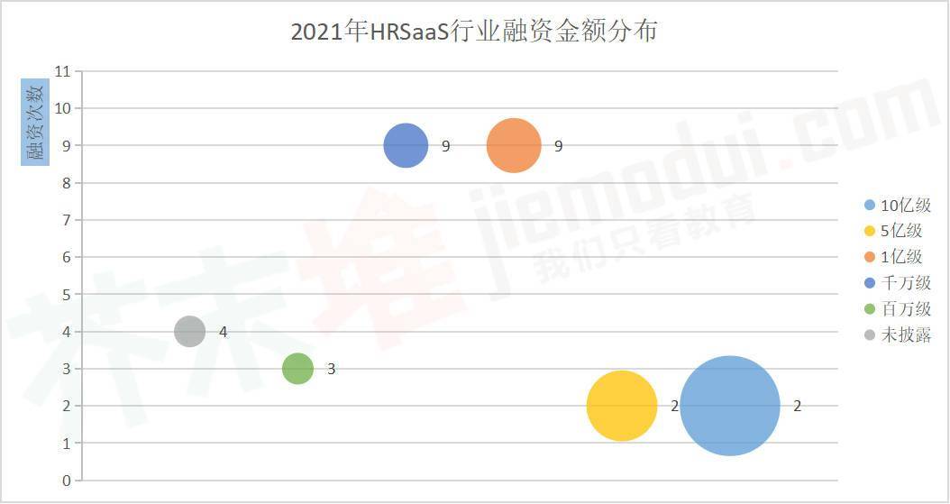 2021年,HRSaaS行業(yè)的融資金額達(dá)到了66.69億元,千萬級到5億級之間的金額是行業(yè)融資的主流。