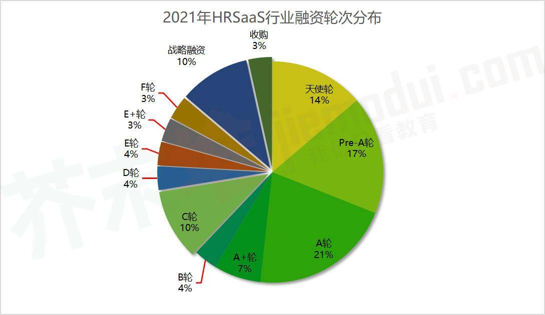 從融資次數(shù)來看,2021年HRSaaS行業(yè)早期融資較為活躍,A+輪之前的融資(不含戰(zhàn)略融資)輪次占據(jù)了全年融資事件的59%,其中A輪融資事件最多,占比21%。戰(zhàn)略融資和C輪融資同樣較為多發(fā),兩者均占比10%。