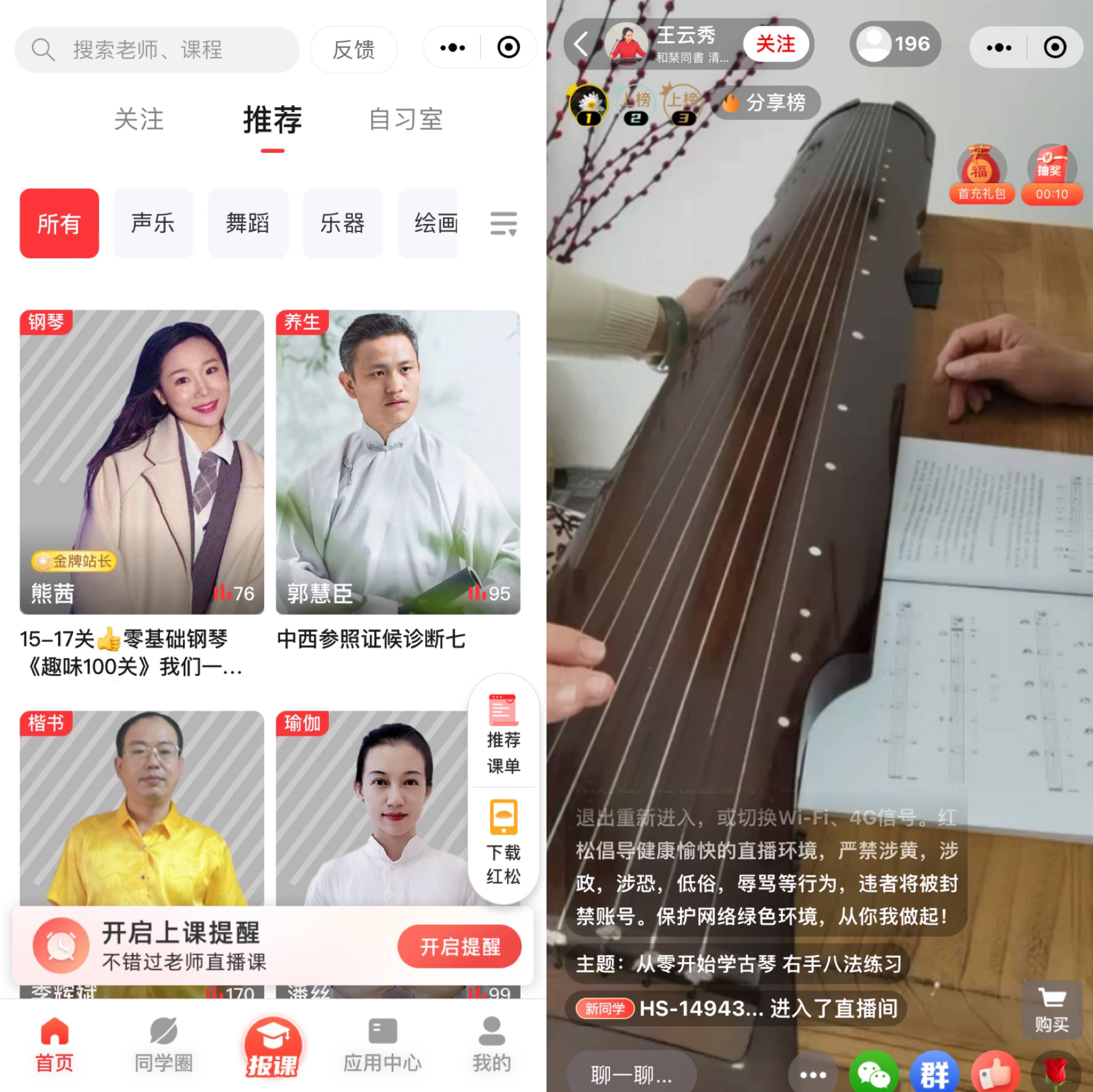 在紅松學堂,用戶通過一個個小站聯系起來。與豆瓣類似,用戶們按照自己的興趣加入不同的小站,聲樂、書畫、攝影等等,與擁有同樣興趣愛好的站內好友交流。站長往往是主動發起話題的人,可能是圖文形式,也可能是持續較長時間的直播課程。同時站長在站內分享中也會有來自打賞、帶貨的收入。