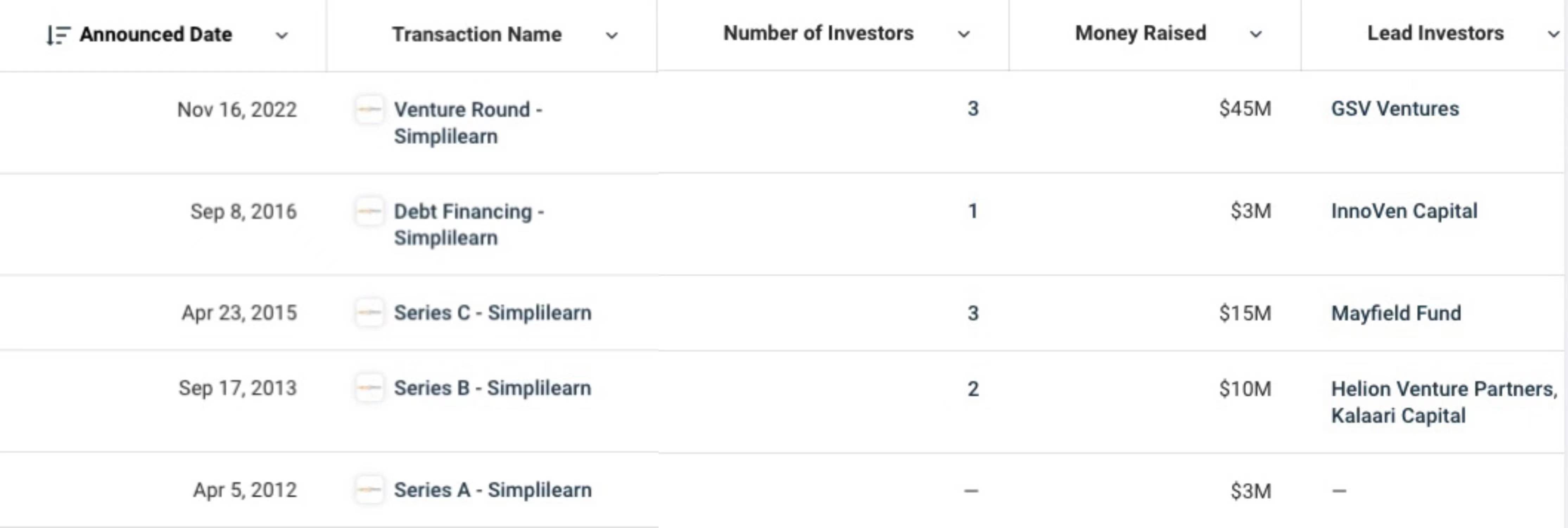 Simplilearn?的上一輪融資發生在2016年9月,是一輪300萬美元的債務融資。截至目前,Simplilearn?的融資總額已達到7600萬美元。