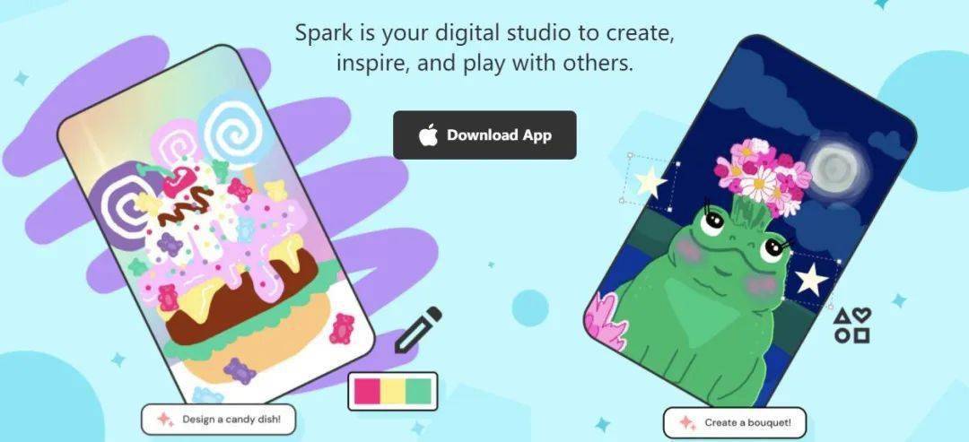 Spark由Laura Mae Brown和Moriah Elizabeth成立于2021年。該公司為創意性的實驗、表達和設計提供了一個數字空間。其應用程序有許多嵌入式工具,并提供靈感庫以供用戶間相互學習。Spark還支持多人合作,簡化的工具包具有預先繪制的模板和動畫,用戶可以在幾分鐘內完成創作。