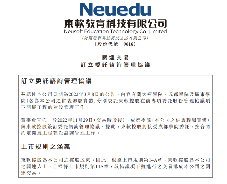 芥末堆文 11月29日,東軟教育發布公告稱,于2022年11月29日(交易時段后),成都學院(公司之并表聯屬實體)與東軟控股簽訂委托咨詢管理協議。