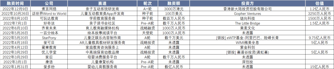 而對(duì)于初創(chuàng)公司,2022年大額融資也屢屢出現(xiàn)。在學(xué)齡前賽道,玩具品牌StarPony獲得了數(shù)千萬(wàn)美元融資,資方是eWTP生態(tài)基金和險(xiǎn)峰K2VC兩家明星資本,并且投后估值超億美元。