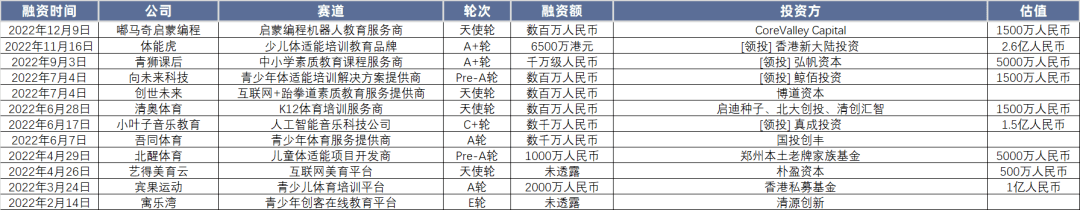 而在素質(zhì)教育及學(xué)前教育領(lǐng)域,由于與學(xué)科類培訓(xùn)相關(guān)的賽道面臨政策調(diào)整,獲得融資的公司以初創(chuàng)公司為主。在素質(zhì)教育賽道,與體能、編程、體育培訓(xùn)、美育相關(guān)的企業(yè)紛紛獲得融資。