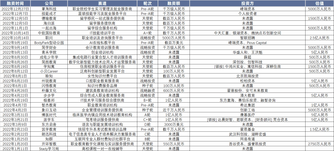在成人教育賽道,全年共有30家機(jī)構(gòu)獲得融資,其中出現(xiàn)了大額融資。眾多公司中,技能培訓(xùn)類是融資的熱門領(lǐng)域。如掌淘科技、技能成才、中軟國(guó)際、城店少年學(xué)、博弈時(shí)代、派學(xué)車等機(jī)構(gòu),都是與技能培訓(xùn)教學(xué)有關(guān)的初創(chuàng)公司。由于賽道涵蓋范圍廣,相關(guān)融資機(jī)構(gòu)涉及的領(lǐng)域非常廣泛,賽道潛力較大。