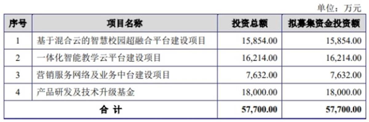 本次IPO金智教育擬在深交所創(chuàng)業(yè)板募資5.77億元,用于“基于混合云的智慧校園超融合平臺建設(shè)項目”、“一體化智能教學(xué)云平臺建設(shè)項目”、“營銷服務(wù)網(wǎng)絡(luò)及業(yè)務(wù)中臺建設(shè)項目”、“產(chǎn)品研發(fā)及技術(shù)升級基金”。