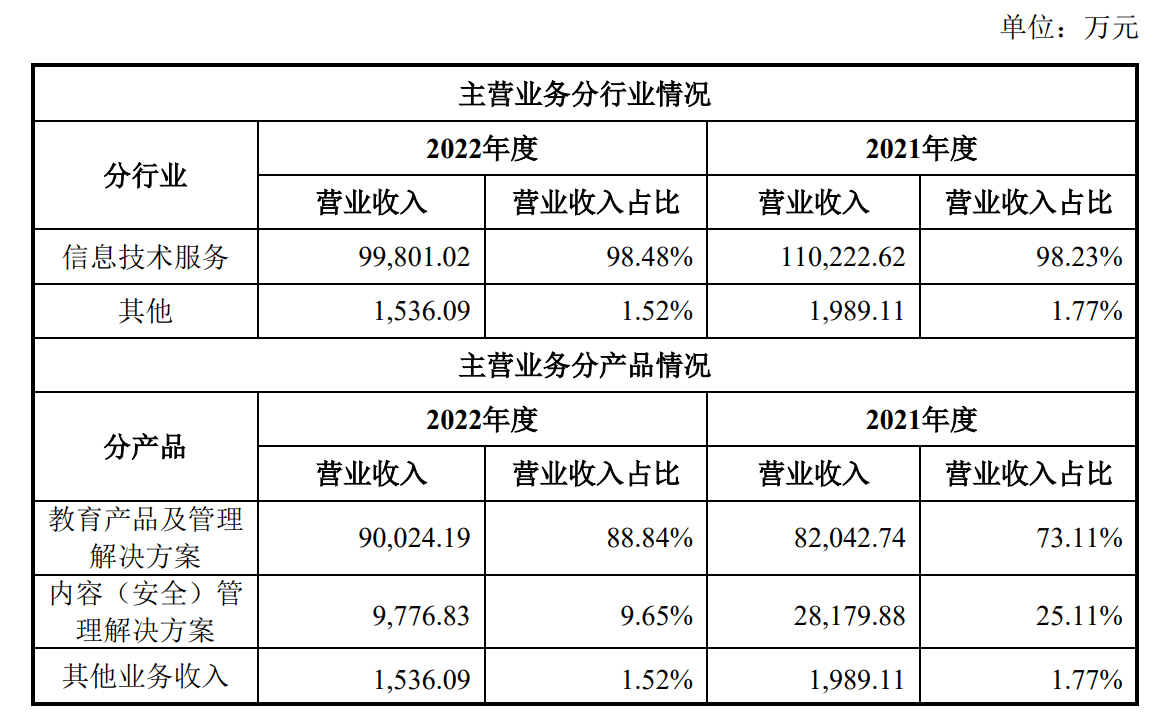 但從業績貢獻上看,截至2022年度,豆神教育的營收依舊靠教育產品及管理解決方案,上述產品在2022年實現營收9.00億元,占總營收比重88.84%;而在2021年度則收入8.20億元,占總收入比重的73.11%。2022年度,內容(安全)管理解決方案產品共收入9776.83萬元,僅貢獻營收的9.65%;對比2021年度的2.82億元營收和25.11%的總營收占比更是出現明顯下降。而風聲巨大的直播業務目前卻仍未有明顯收入貢獻。
