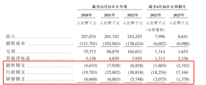 費用方面,2022年,邁越科技的銷售開支、行政開支、研發開支分別為682.8萬元、3081.8萬元、574.8萬元,除了行政開支同比有所增加,其他費用支出和上年相比均有所下降。2023年前四個月,邁越科技的研發開支為137.8萬元,和上年同期的307.5萬元相比減少54.8%。對此,公司稱主要是由于員工成本及外判服務減少。