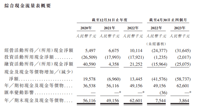 現金方面,2022年邁越科技經營活動產生現金凈流入1011.4萬元,投資活動產生現金凈流出1792.1萬元,融資活動產生現金凈流入2125.2萬元。截至2023年4月30日,公司的現金及現金等價物為386.4萬元。