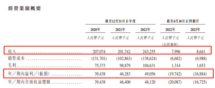 利潤方面,2020年-2022年,邁越科技期內溢利分別為3943.8萬元、4628.3萬元、4905.6萬元,毛利分別為7537.3萬元、9887.9萬元、1.05億元,毛利率分別為36.4%、49%、43%。2023年前四個月,公司錄得期內虧損1688.4萬元,和2022年同期虧損1974.2萬元相比有所收窄,毛利為165.3萬元,毛利率為19.1%。對于虧損,邁越科技表示,主要是公司業務運營受季節性影響。